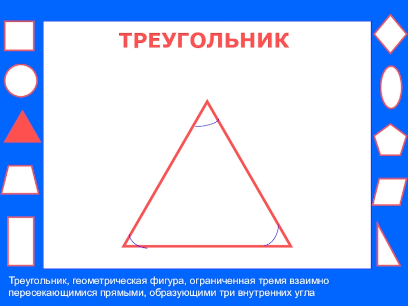 ТРЕУГОЛЬНИКТреугольник, геометрическая фигура, ограниченная тремя взаимно пересекающимися прямыми, образующими три внутренних угла