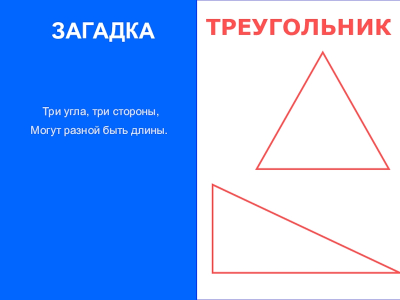 ЗАГАДКА Три угла, три стороны,Могут разной быть длины.
