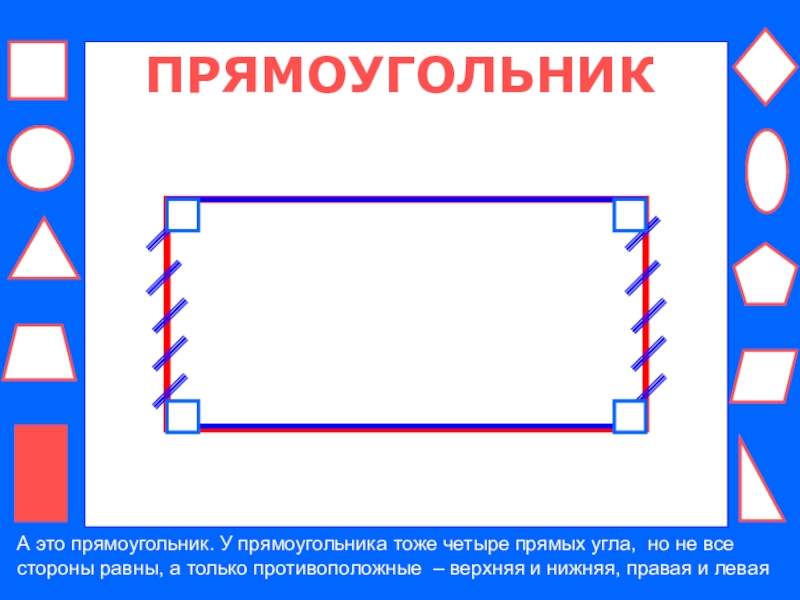 ПРЯМОУГОЛЬНИКА это прямоугольник. У прямоугольника тоже четыре прямых угла, но не все стороны равны, а только противоположные