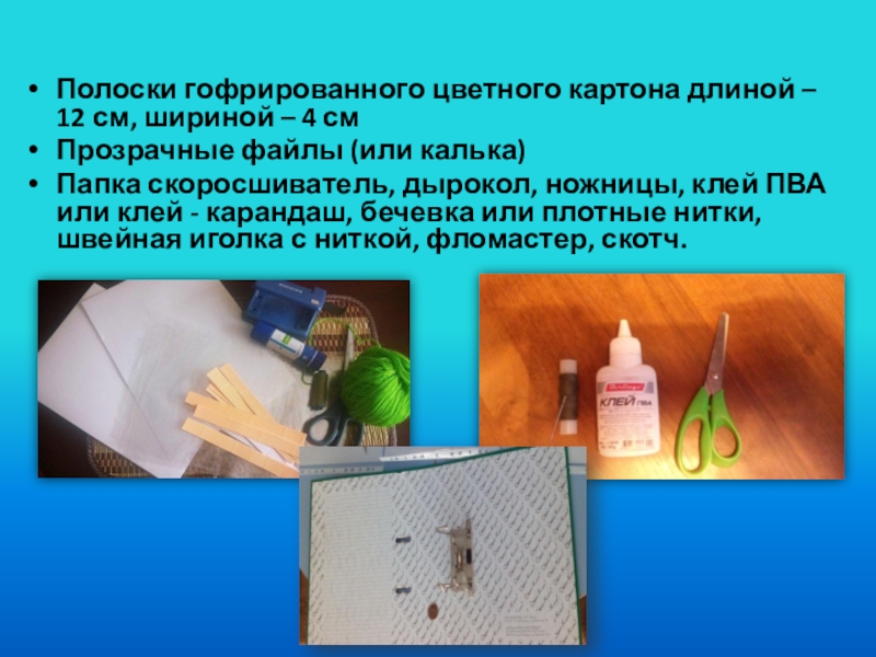 Папка скоросшиватель, дырокол, ножницы, клей ПВА или клей - карандаш, бечевка или плотные нитки, швейная иголка с ниткой, фломастер, скотч.
