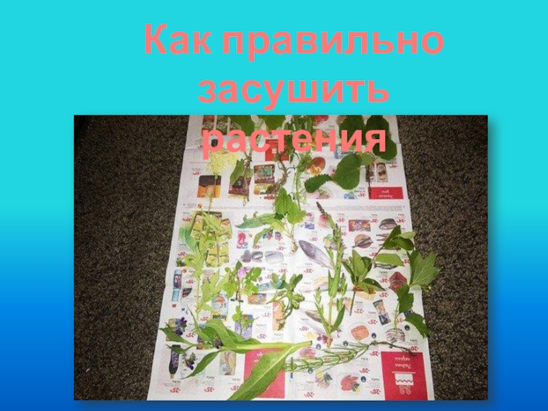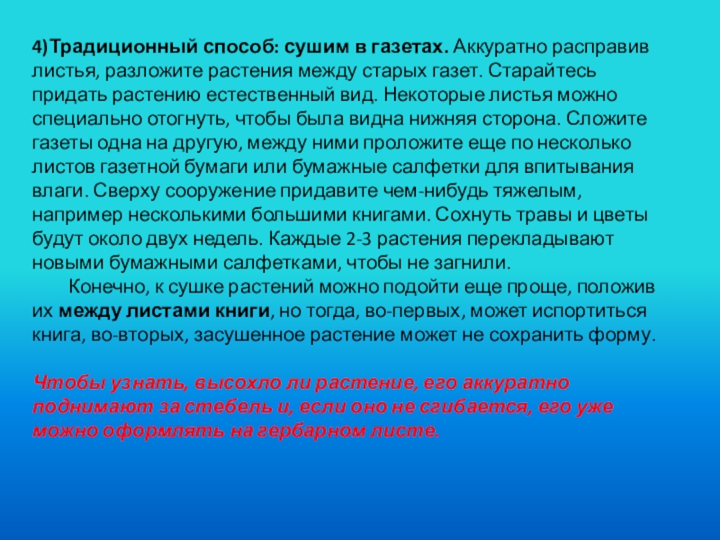 Слайд 114)Традиционный способ: сушим в газетах. Аккуратно расправив листья, разложите растения между