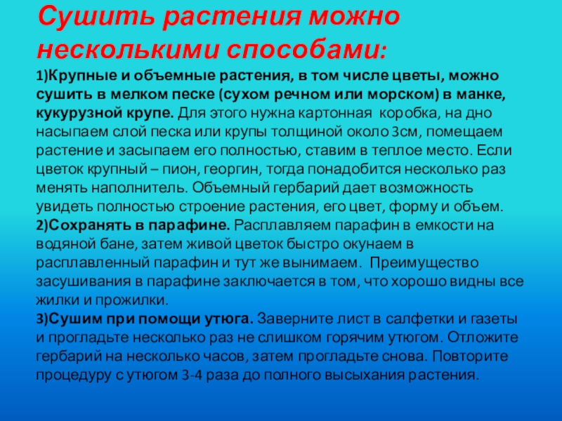 цветы, можно сушить в мелком песке (сухом речном или морском) в манке, кукурузной крупе. Для этого нужна картонная коробка, на дно насыпаем слой песка или крупы толщиной около 3см, помещаем растение и засыпаем его полностью, ставим в теплое место. Если цветок крупный – пион, георгин, тогда понадобится несколько раз менять наполнитель. Объемный гербарий дает возможность увидеть полностью строение растения, его цвет, форму и объем.