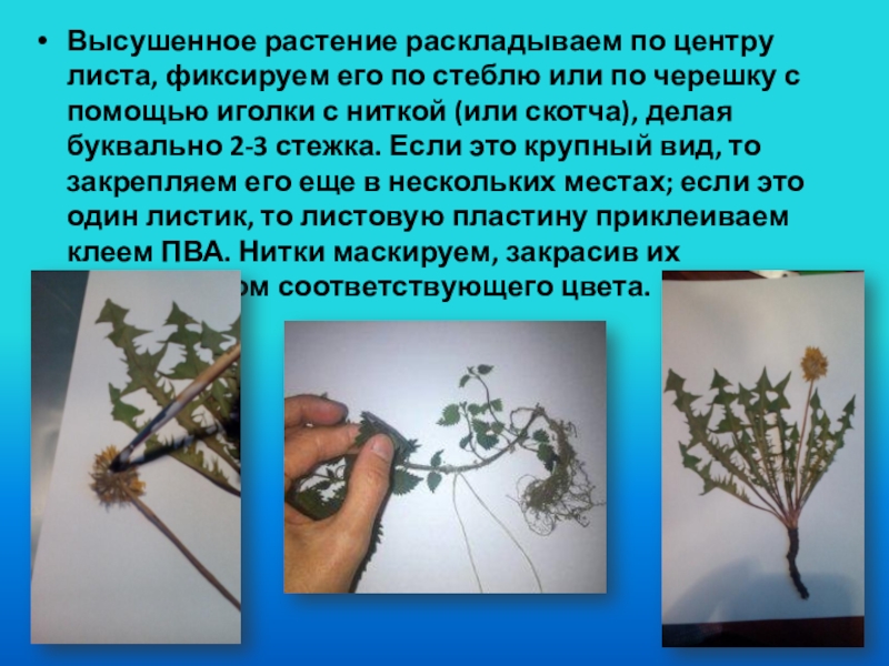 Слайд 14Высушенное растение раскладываем по центру листа, фиксируем его по стеблю или