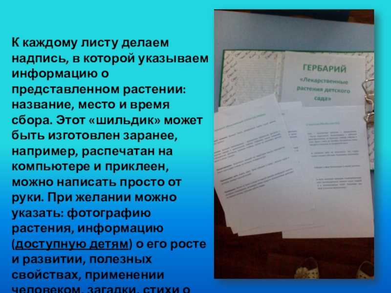 растении: название, место и время сбора. Этот «шильдик» может быть изготовлен заранее, например, распечатан на компьютере и приклеен, можно написать просто от руки. При желании можно указать: фотографию растения, информацию (доступную детям) о его росте и развитии, полезных свойствах, применении человеком, загадки, стихи о растении и т.п.