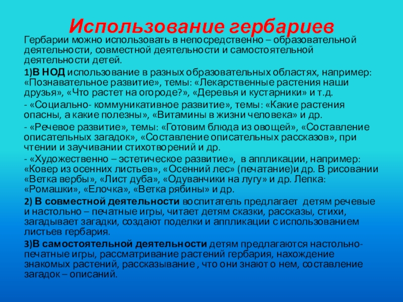 1)В НОД использование в разных образовательных областях, например: «Познавательное развитие», темы: «Лекарственные растения наши друзья», «Что растет на огороде?», «Деревья и кустарники» и т.д.