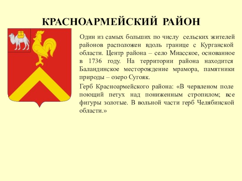 Герб Красноармейского района: «В червленом поле поющий петух над пониженным стропилом; все фигуры золотые. В вольной части герб Челябинской области.»