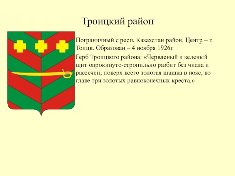 Герб Троицкого района: «Червленый и зеленый щит опрокинуто-стропильно разбит без числа и рассечен; поверх всего золотая шашка в пояс, во главе три золотых равноконечных креста.»