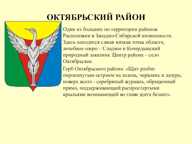 Герб Октябрьского района: «Щит разбит опрокинутым острием на зелень, червлень и лазурь; поверх всего - серебряный журавль, обращенный прямо, поддерживающий распростертыми крыльями возникающий во главе щита безант».