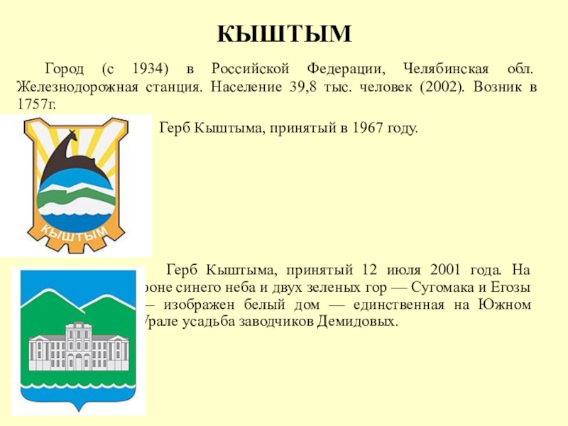 Герб Кыштыма, принятый 12 июля 2001 года. На фоне синего неба и двух зеленых гор — Сугомака и Егозы — изображен белый дом — единственная на Южном Урале усадьба заводчиков Демидовых.