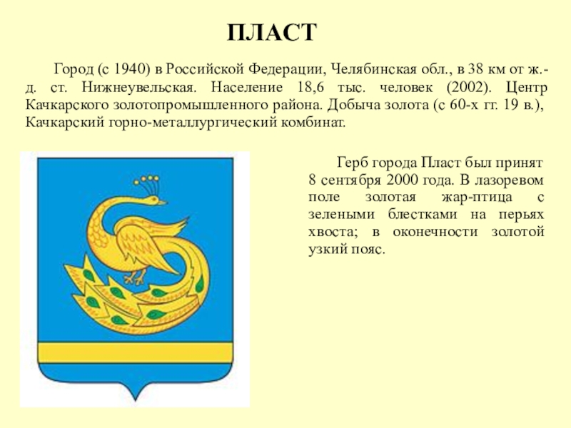 Герб города Пласт был принят 8 сентября 2000 года. В лазоревом поле золотая жар-птица с зелеными блестками на перьях хвоста; в оконечности золотой узкий пояс.