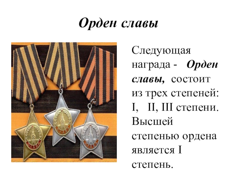 Орден славы  Следующая награда -  Орден славы, состоит из трех степеней: I,  II, III