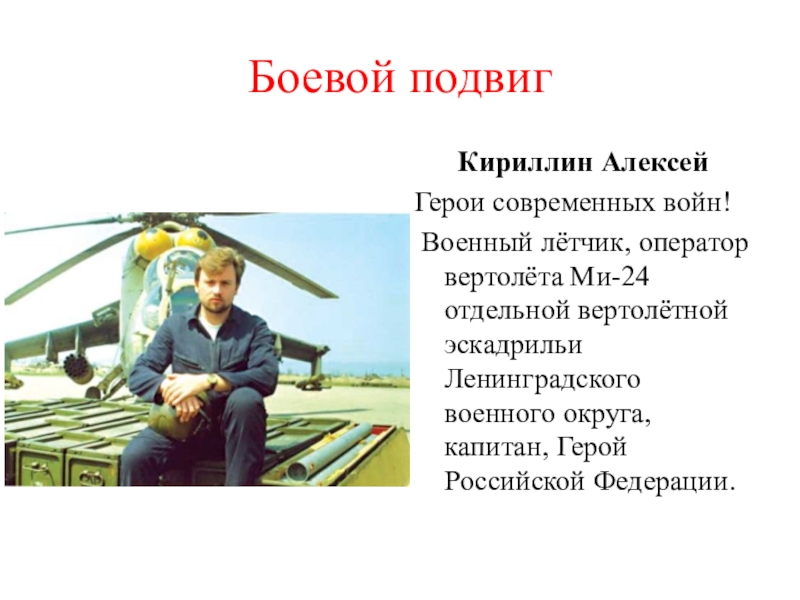 Боевой подвигКириллин АлексейГерои современных войн! Военный лётчик, оператор вертолёта Ми-24 отдельной вертолётной эскадрильи Ленинградского военного округа, капитан,