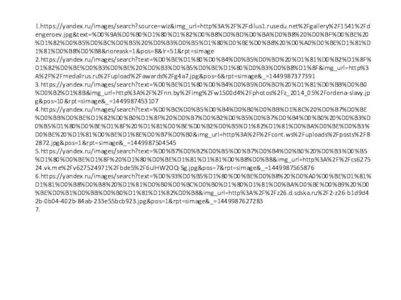 1.https://yandex.ru/images/search?source=wiz&img_url=http%3A%2F%2Fdilus1.rusedu.net%2Fgallery%2F1541%2Fdengeroev.jpg&text=%D0%9A%D0%B0%D1%80%D1%82%D0%B8%D0%BD%D0%BA%D0%B8%20%D0%BF%D0%BE%20%D1%82%D0%B5%D0%BC%D0%B5%20%D0%B3%D0%B5%D1%80%D0%BE%D0%B8%20%D0%A0%D0%BE%D1%81%D1%81%D0%B8%D0%B8&noreask=1&pos=8&lr=51&rpt=simage 2.https://yandex.ru/images/search?text=%D0%BE%D1%80%D0%B4%D0%B5%D0%BD%20%D1%81%D0%B2%D1%8F%D1%82%D0%BE%D0%B3%D0%BE%20%D0%B3%D0%B5%D0%BE%D1%80%D0%B3%D0%B8%D1%8F&img_url=http%3A%2F%2Fmedalirus.ru%2Fupload%2Fawards%2Fg4a7.jpg&pos=6&rpt=simage&_=1449987377391 3.https://yandex.ru/images/search?text=%D0%BE%D1%80%D0%B4%D0%B5%D0%BD%20%D1%81%D0%BB%D0%B0%D0%B2%D1%8B&img_url=http%3A%2F%2Fnn.by%2Fimg%2Fw1500d4%2Fphotos%2Fz_2014_05%2Fordena-slavy.jpg&pos=10&rpt=simage&_=1449987453107 4.https://yandex.ru/images/search?text=%D0%BC%D0%B5%D0%B4%D0%B0%D0%BB%D1%8C%20%D0%B7%D0%BE%D0%BB%D0%BE%D1%82%D0%B0%D1%8F%20%D0%B7%D0%B2%D0%B5%D0%B7%D0%B4%D0%B0%20%D0%B3%D0%B5%D1%80%D0%BE%D1%8F%20%D1%81%D0%BE%D0%B2%D0%B5%D1%82%D1%81%D0%BA%D0%BE%D0%B3%D0%BE%20%D1%81%D0%BE%D1%8E%D0%B7%D0%B0&img_url=http%3A%2F%2Fcont.ws%2Fuploads%2Fposts%2F82872.jpg&pos=1&rpt=simage&_=1449987504545  5.https://yandex.ru/images/search?text=%D0%B7%D0%B2%D0%B5%D0%B7%D0%B4%D0%B0%20%D0%B3%D0%B5%D1%80%D0%BE%D1%8F%20%D1%80%D0%BE%D1%81%D1%81%D0%B8%D0%B8&img_url=http%3A%2F%2Fcs627524.vk.me%2Fv627524971%2Fbde5%2F6ulHW2OQ-Sg.jpg&pos=7&rpt=simage&_=1449987565876 6.https://yandex.ru/images/search?text=%D0%93%D0%B5%D1%80%D0%BE%D0%B8%20%D0%A0%D0%BE%D1%81%D1%81%D0%B8%D0%B8%20%D1%81%D0%B0%D0%BC%D0%B0%D1%80%D1%81%D0%BA%D0%BE%D0%B9%20%D0%BE%D0%B1%D0%BB%D0%B0%D1%81%D1%82%D0%B8&img_url=http%3A%2F%2Fz26.d.sdska.ru%2F2-z26-b1d9d42b-0b04-402b-84ab-233e55bcb923.jpg&pos=1&rpt=simage&_=1449987627283 7.