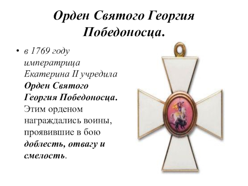Орден Святого Георгия Победоносца.в 1769 году императрица Екатерина II учредила Орден Святого Георгия Победоносца. Этим орденом награждались воины, проявившие в бою доблесть, отвагу и смелость.