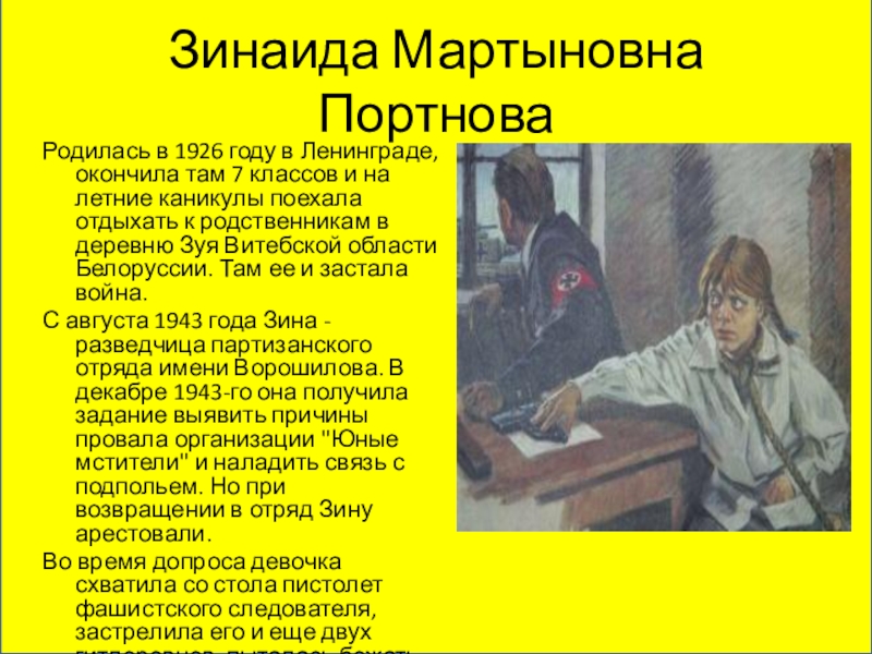 С августа 1943 года Зина - разведчица партизанского отряда имени Ворошилова. В декабре 1943-го она получила задание выявить причины провала организации "Юные мстители" и наладить связь с подпольем. Но при возвращении в отряд Зину арестовали.