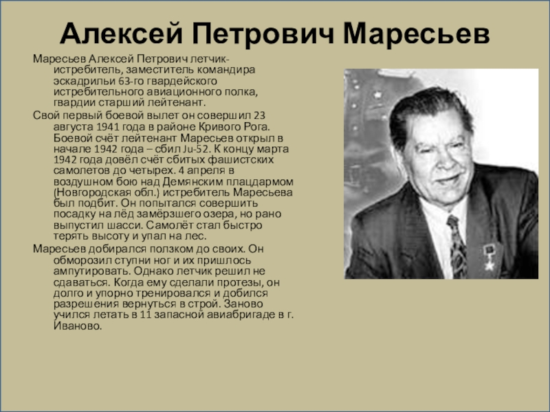 Алексей Петрович Маресьев Маресьев Алексей Петрович летчик-истребитель, заместитель командира эскадрильи 63-го гвардейского истребительного авиационного полка, гвардии старший