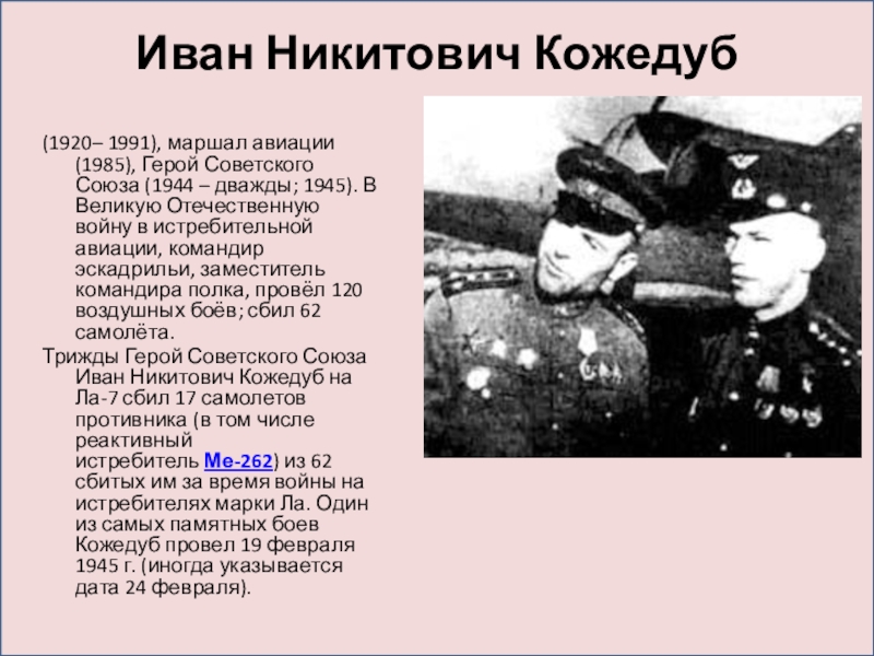 Иван Никитович Кожедуб (1920– 1991), маршал авиации (1985), Герой Советского Союза (1944 – дважды; 1945). В Великую