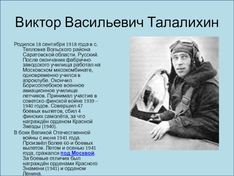 Виктор Васильевич Талалихин Родился 18 сентября 1918 года в с. Тепловке Вольского района Саратовской области. Русский. После окончания фабрично-заводского училища работал на Московском мясокомбинате, одновременно учился в аэроклубе. Окончил Борисоглебокое военное авиационное училище летчиков. Принимал участие