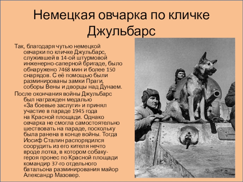 Немецкая овчарка по кличке ДжульбарсТак, благодаря чутью немецкой овчарки по кличке Джульбарс, служившей в 14-ой штурмовой инженерно-саперной бригаде, было обнаружено