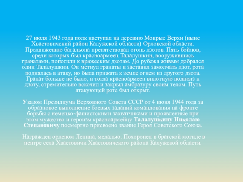 Хвастовичский район Калужской области) Орловской области. Продвижению батальона препятствовал огонь дзотов. Пять бойцов, среди которых был красноармеец Талалушкин, вооружившись гранатами, поползли к вражеским дзотам. До рубежа живым добрался один Талалушкин. Он метнул гранаты и заставил замолчать дзот, рота поднялась в атаку, но была прижата к земле огнем из другого дзота. Гранат больше не было, и тогда красноармеец вплотную подполз к дзоту, стремительно вскочил и закрыл амбразуру своим телом. Путь атакующей роте был открыт.
