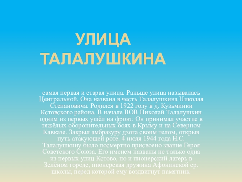 Слайд 15УЛИЦА ТАЛАЛУШКИНА