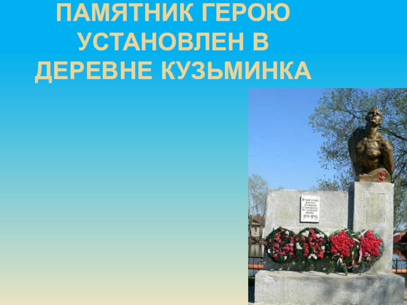 Слайд 18ПАМЯТНИК ГЕРОЮ УСТАНОВЛЕН В ДЕРЕВНЕ КУЗЬМИНКА