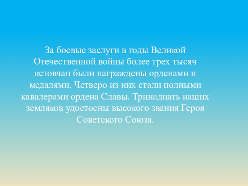 кстовчан были награждены орденами и медалями. Четверо из них стали полными кавалерами ордена Славы. Тринадцать наших земляков удостоены высокого звания Героя Советского Союза.