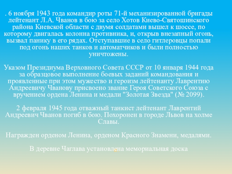лейтенант Л.А. Чванов в бою за село Хотов Киево-Святошинского района Киевской области с двумя солдатами вышел к шоссе, по которому двигалась колонна противника, и, открыв внезапный огонь, вызвал панику в его рядах. Отступавшие в село гитлеровцы попали под огонь наших танков и автоматчиков и были полностью уничтожены.