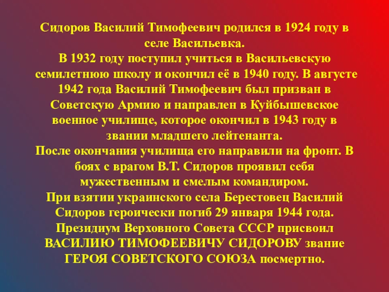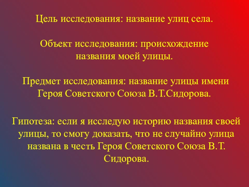 Гипотеза: если я исследую историю названия своей улицы, то смогу доказать, что не случайно улица названа в честь Героя Советского Союза В.Т. Сидорова.