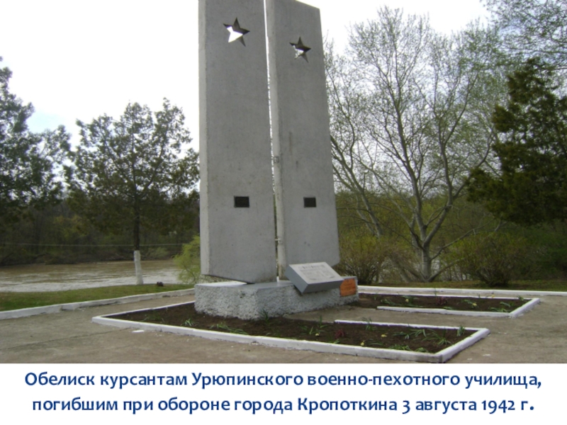 Слайд 3Обелиск курсантам Урюпинского военно-пехотного училища, погибшим при обороне города Кропоткина 3