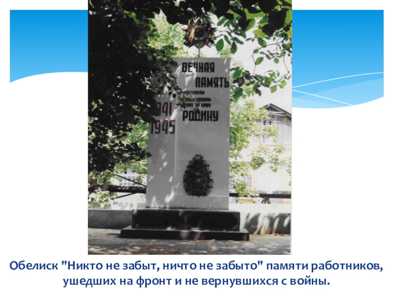 Слайд 11Обелиск "Никто не забыт, ничто не забыто" памяти работников, ушедших на