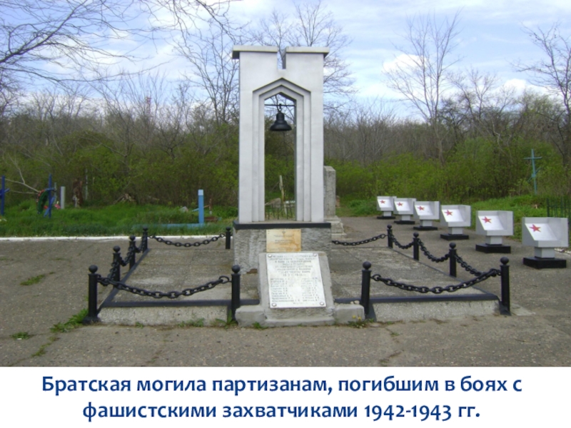 Слайд 4Братская могила партизанам, погибшим в боях с фашистскими захватчиками 1942-1943 гг.
