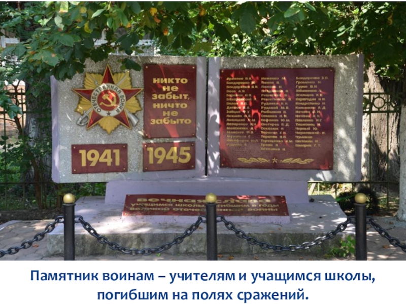 Слайд 9Памятник воинам – учителям и учащимся школы, погибшим на полях сражений.