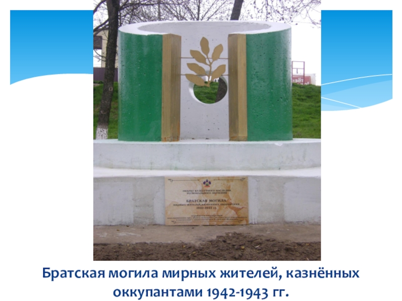 Слайд 12Братская могила мирных жителей, казнённых оккупантами 1942-1943 гг.