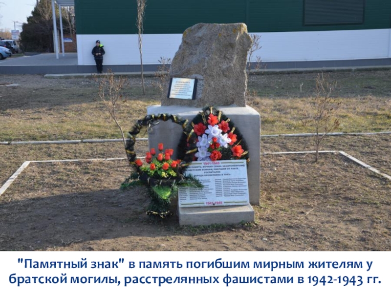 Слайд 14"Памятный знак" в память погибшим мирным жителям у братской могилы, расстрелянных