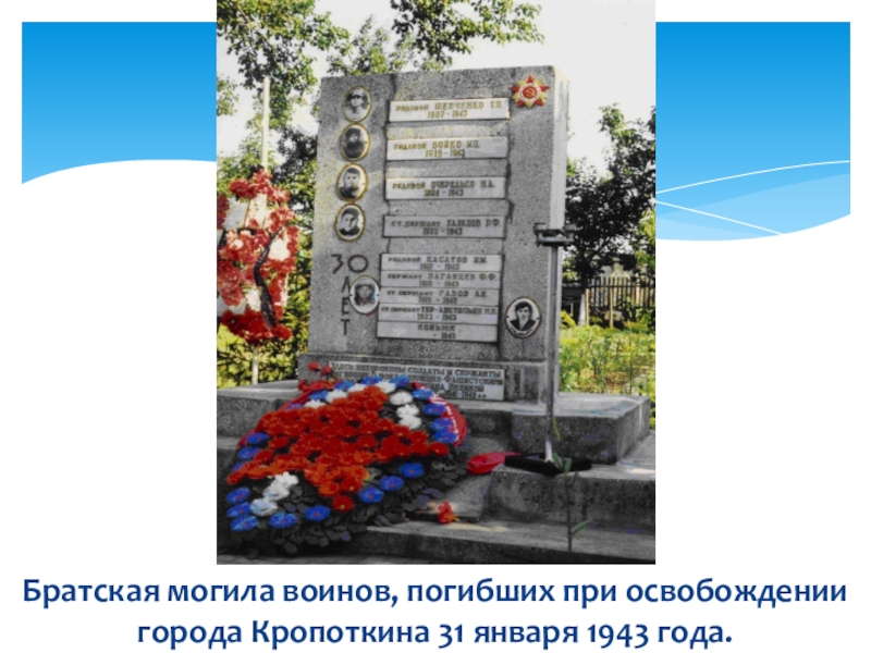 Слайд 8Братская могила воинов, погибших при освобождении города Кропоткина 31 января 1943