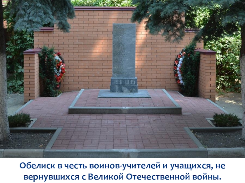 Слайд 10Обелиск в честь воинов-учителей и учащихся, не вернувшихся с Великой Отечественной