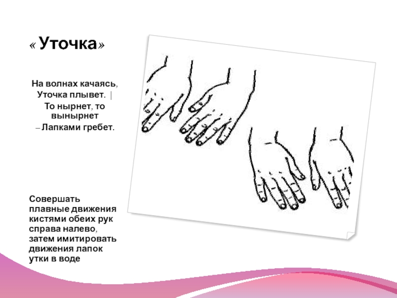 движения кистями обеих рук справа налево, затем имитировать движения лапок утки в воде