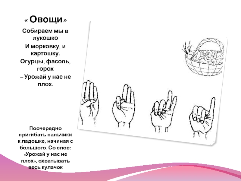 Поочередно пригибать пальчики к ладошке, начиная с большого. Со слов: «Урожай у нас не плох», охватывать весь кулачок
