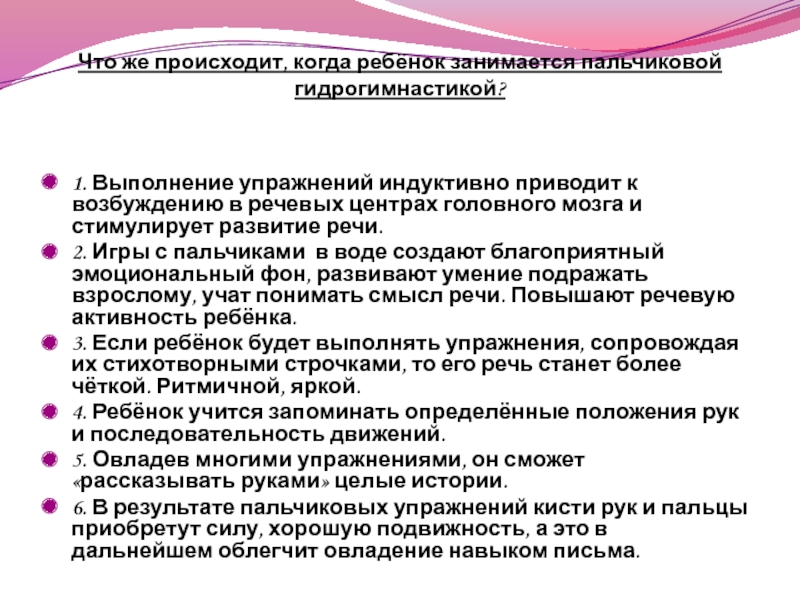 Слайд 4Что же происходит, когда ребёнок занимается пальчиковой гидрогимнастикой?