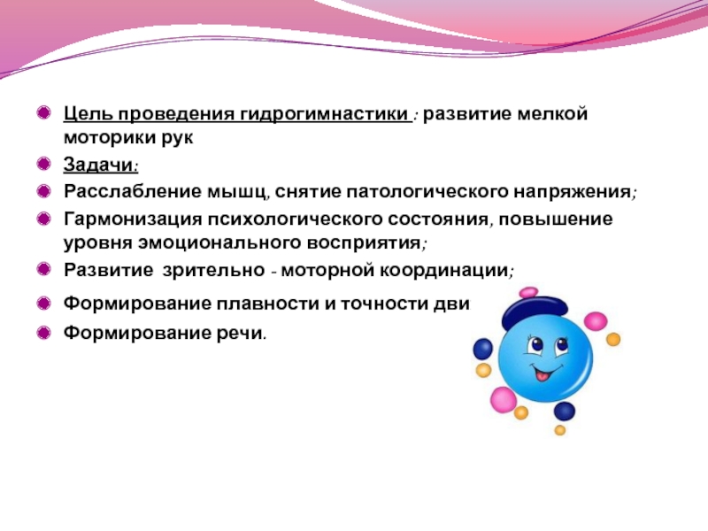 Цель проведения гидрогимнастики : развитие мелкой моторики рук