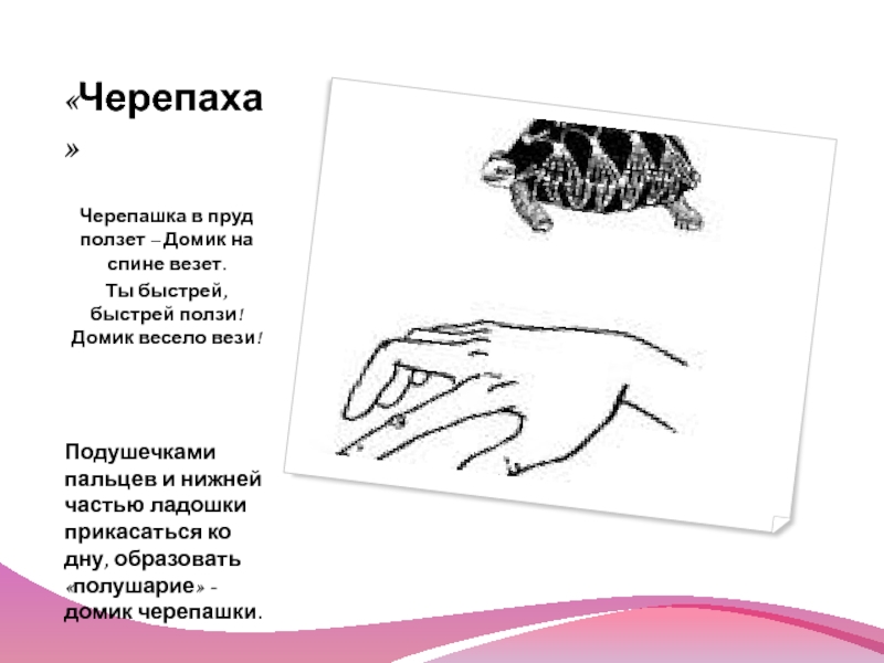 Подушечками пальцев и нижней частью ладошки прикасаться ко дну, образовать «полушарие» - домик черепашки.