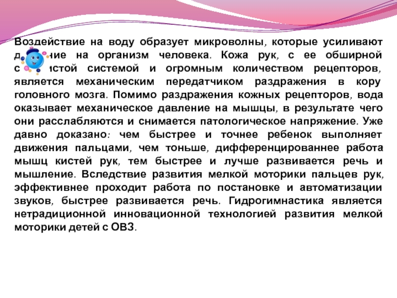 Кожа рук, с ее обширной сосудистой системой и огромным количеством рецепторов, является механическим передатчиком раздражения в кору головного мозга. Помимо раздражения кожных рецепторов, вода оказывает механическое давление на мышцы, в результате чего они расслабляются и снимается патологическое напряжение. Уже давно доказано: чем быстрее и точнее ребенок выполняет движения пальцами, чем тоньше, дифференцированнее работа мышц кистей рук, тем быстрее и лучше развивается речь и мышление. Вследствие развития мелкой моторики пальцев рук, эффективнее проходит работа по постановке и автоматизации звуков, быстрее развивается речь. Гидрогимнастика является нетрадиционной инновационной технологией развития мелкой моторики детей с ОВЗ.