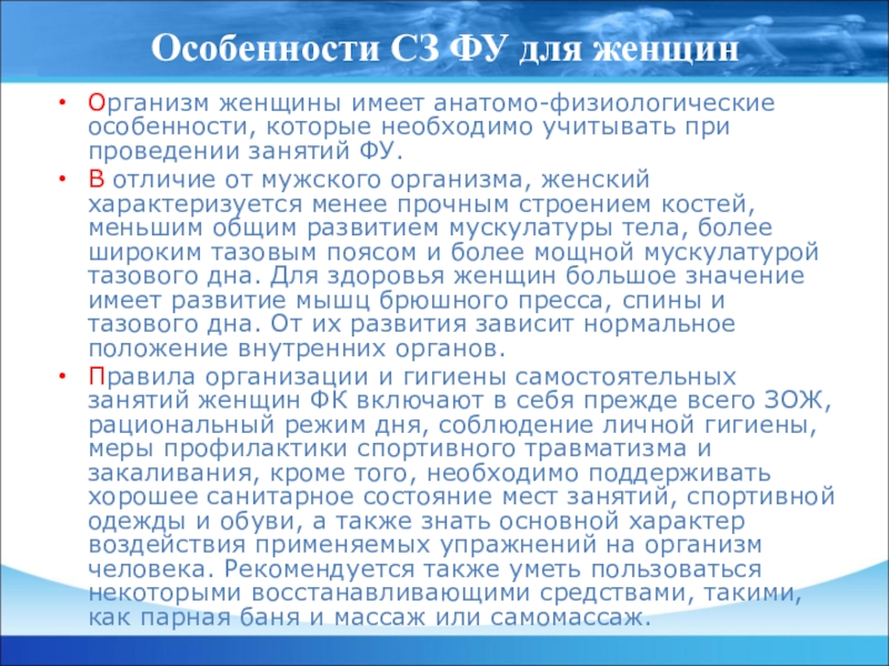 Правила организации и гигиены самостоятельных занятий женщин ФК включают в себя прежде всего ЗОЖ, рациональный режим дня, соблюдение личной гигиены, меры профилактики спортивного травматизма и закаливания, кроме того, необходимо поддерживать хорошее санитарное состояние мест занятий, спортивной одежды и обуви, а также знать основной характер воздействия применяемых упражнений на организм человека. Рекомендуется также уметь пользоваться некоторыми восстанавливающими средствами, такими, как парная баня и массаж или самомассаж.