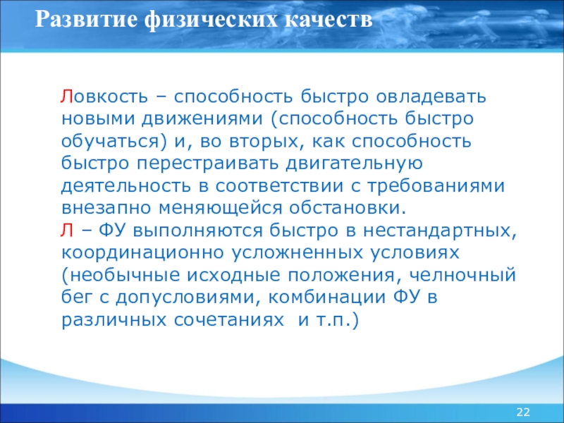 Слайд 22 Ловкость – способность быстро овладевать новыми движениями (способность быстро