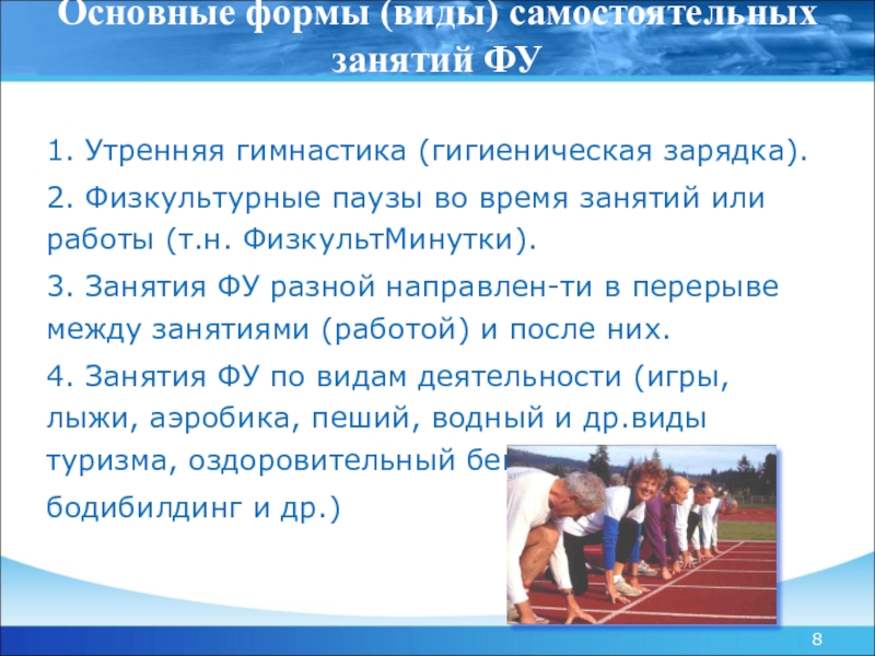 Слайд 8Основные формы (виды) самостоятельных занятий ФУ