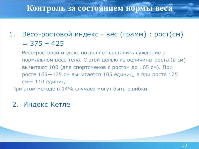 Весо-ростовой индекс позволяет составить суждение о нормальном весе тела. С этой целью из величины роста (в см) вычитают 100 (для спортсменов с ростом до 165 см). При росте 165—175 см вычитается 105 единиц, а при росте 175 см— 110 единиц.