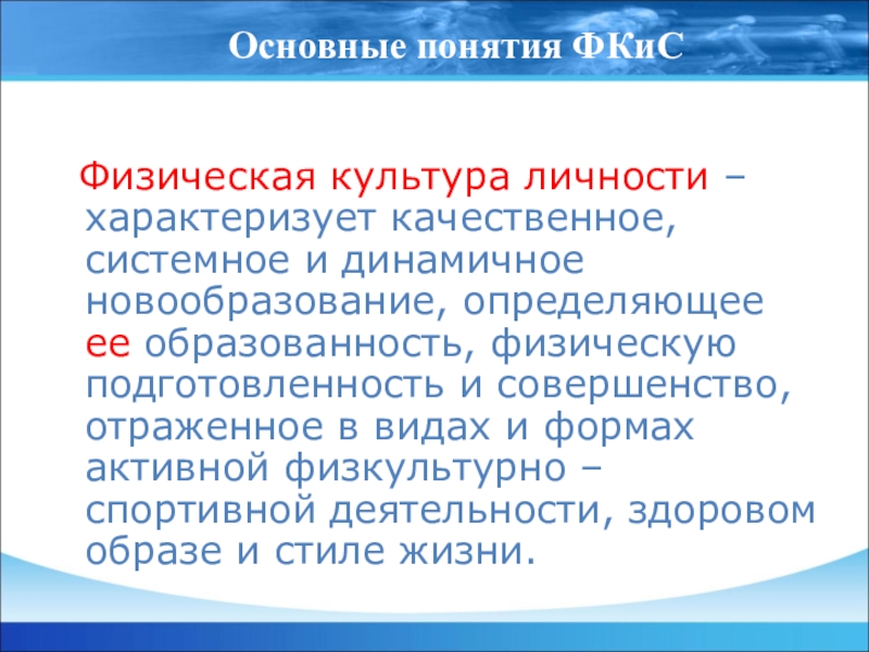 и динамичное новообразование, определяющее ее образованность, физическую подготовленность и совершенство, отраженное в видах и формах активной физкультурно – спортивной деятельности, здоровом образе и стиле жизни.