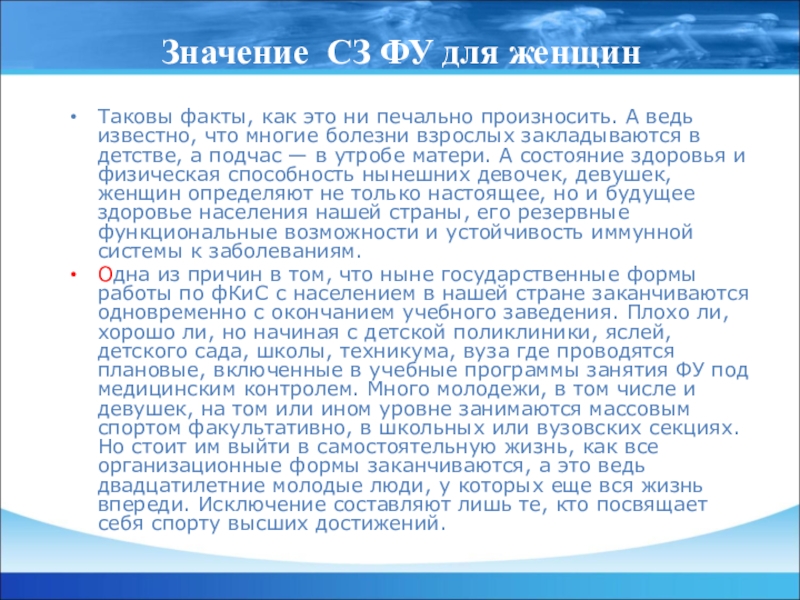 Одна из причин в том, что ныне государственные формы работы по фКиС с населением в нашей стране заканчиваются одновременно с окончанием учебного заведения. Плохо ли, хорошо ли, но начиная с детской поликлиники, яслей, детского сада, школы, техникума, вуза где проводятся плановые, включенные в учебные программы занятия ФУ под медицинским контролем. Много молодежи, в том числе и девушек, на том или ином уровне занимаются массовым спортом факультативно, в школьных или вузовских секциях. Но стоит им выйти в самостоятельную жизнь, как все организационные формы заканчиваются, а это ведь двадцатилетние молодые люди, у которых еще вся жизнь впереди. Исключение составляют лишь те, кто посвящает себя спорту высших достижений.