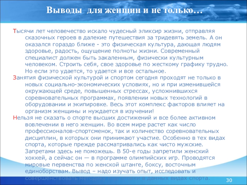 Занятия физической культурой и спортом сегодня проходят не только в новых социально-экономических условиях, но и при изменившейся окружающей среде, повышенных стрессах, усложнившихся соревновательных программах, появлении новых технологий в оборудовании и экипировке. Весь этот комплекс факторов влияет на организм женщины и нуждается в изучении!